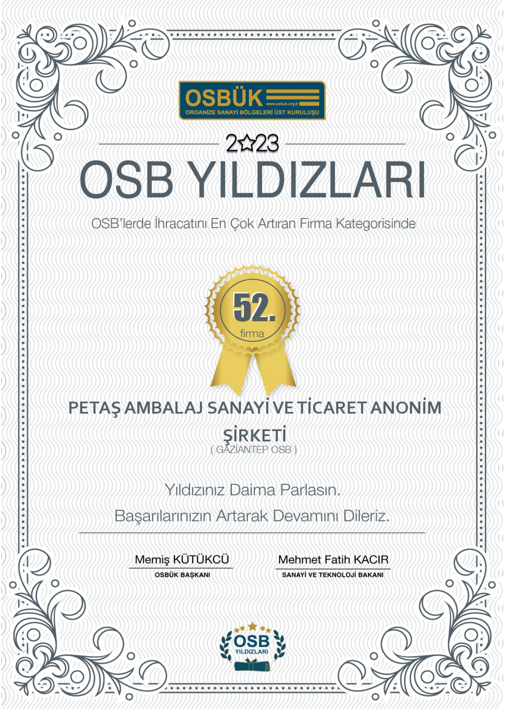 PETAŞ Ambalaj Sanayi ve Ticaret A.Ş., Organize Sanayi Bölgeleri Üst Kuruluşu (OSBÜK) tarafından düzenlenen prestijli "2025 OSB Yıldızları Araştırması Ödül Töreni"nde uluslararası alandaki başarısıyla dikkat çekti.